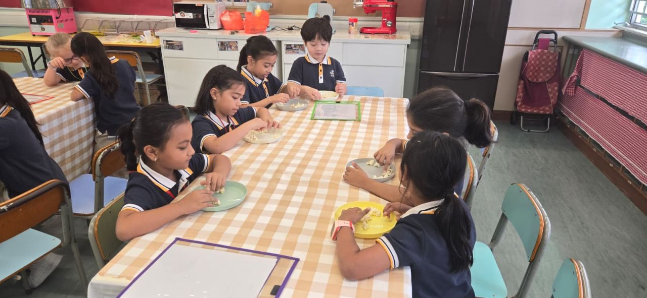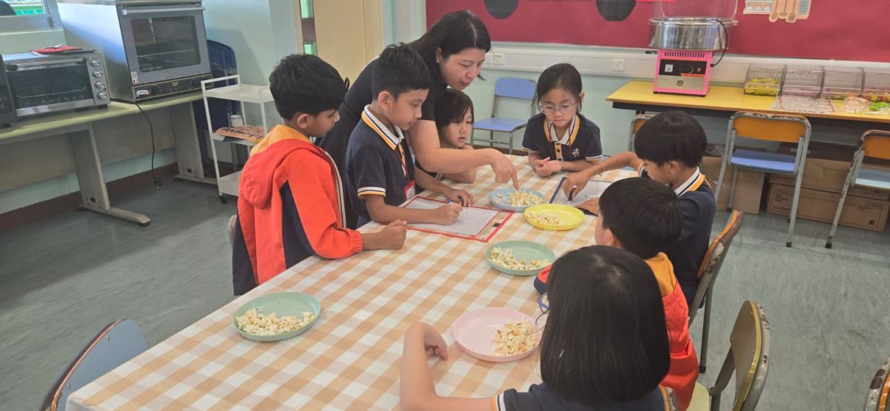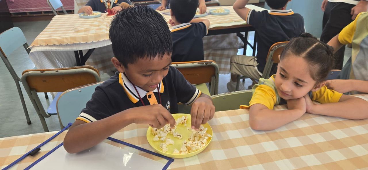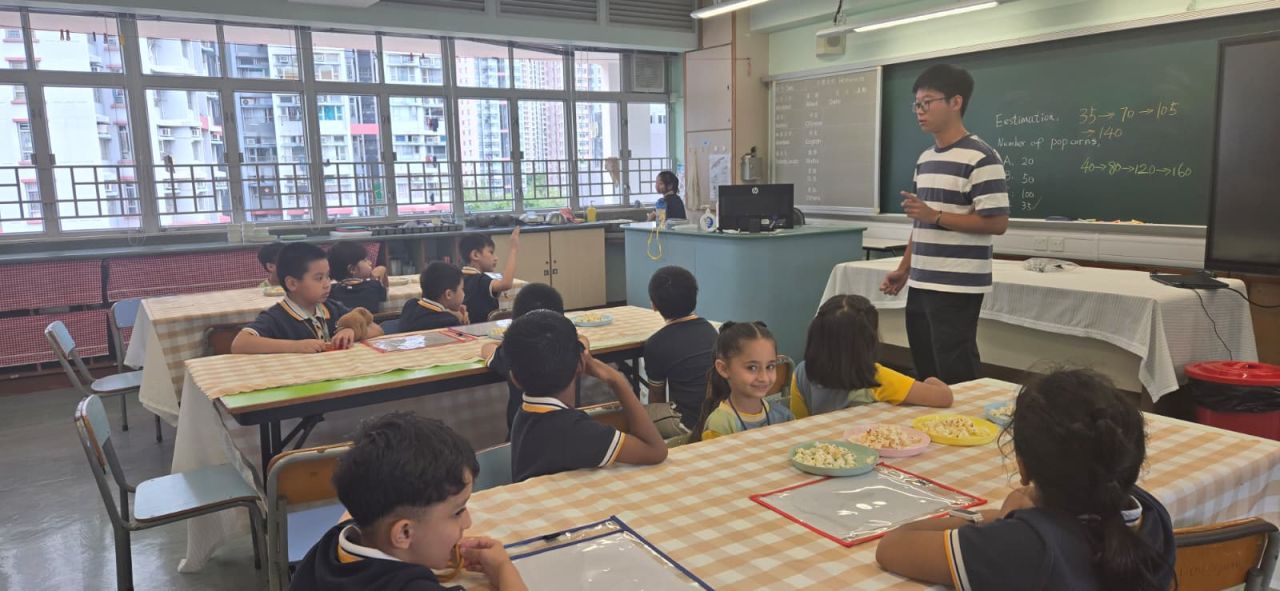 上周五,二年級的數學課迎來了一場充滿香氣與歡笑的特別體驗 —— 老師們帶領學生們透過製作爆米花,將抽象的數學知識轉化為生動的實踐活動。活動中,學生們先估計一個紙杯內的爆米花數量,再通過唱數驗證自己的猜測,最終得出一杯大約可裝 25 顆爆米花;接着,老師根據每組盤子數目的不同,指導學生們將相應數量紙杯內的爆米花倒入各個盤子中,並讓大家按“每 25 顆一數”的方式計數,記錄出總爆米花數。這堂以爆米花為主題的數學課,不僅讓原本抽象的「數數、估算、分組」知識變得具體可感,更讓孩子們在快樂的體驗中學會數學知識,大幅提升了學習興趣。